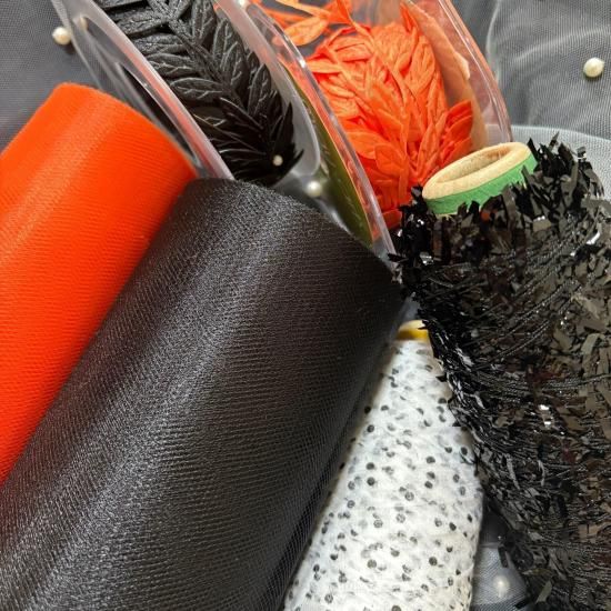 ハロウィン作品用資材セット。 チュール(オレンジ&ブラック)各1m リーフブレード(オレンジ&ブラック)各50cm ドッド紐 2m ブラックキラキラ紐 2m